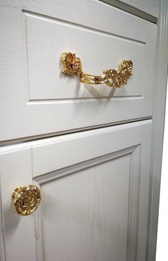 Описание: два распашных фасада, вкладные полки, два выдвижных фасада, ручки золото.