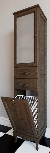 Описание: два распашных фасада, вкладные полки, два выдвижных фасада, корзина, ручки бронза.