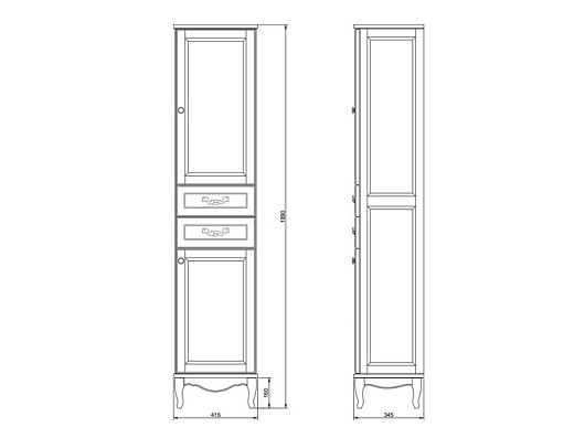 Описание: два распашных фасада, вкладные полки, два выдвижных фасада, ручки бронза.