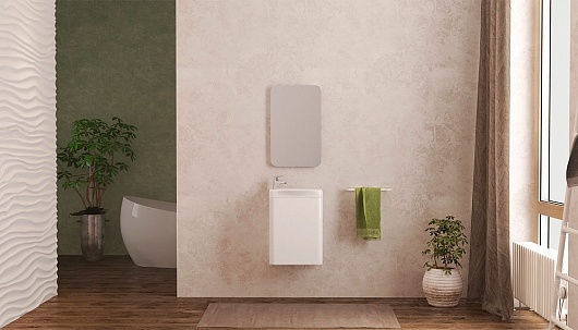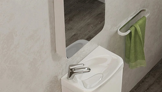 Описание: зеркальное полотно, МДФ, облицованная пленкой ПВХ, стеклянная полка за распашной дверцей.