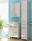 Комплектация: зеркальное полотно с нижней полкой и козырьком со встроенной подсветкой и розеткой. Справа расположен глянцевый распашной шкаф с механизмом плавного закрывания, вкладными полками и хромированной ручкой.