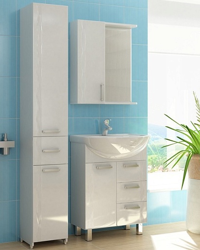 Комплектация: зеркальное полотно с нижней полкой и козырьком. Слева расположен глянцевый распашной шкаф с механизмом плавного закрывания, вкладными полками и хромированной ручкой.