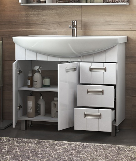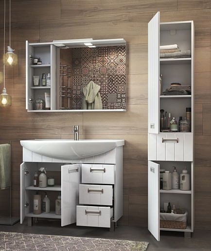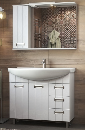 В комплекте: тумба, раковина, сифон, зеркальный шкаф, ножка (4 шт.).