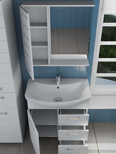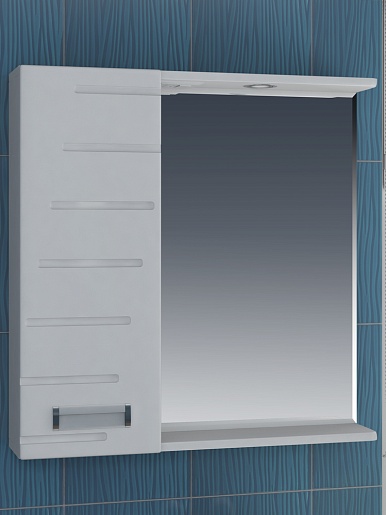 Комплектация: зеркальное полотно прямоугольной формы. Распашной шкаф с механизмом плавного закрывания, вкладными полками и врезной хромированной, металлической ручкой.