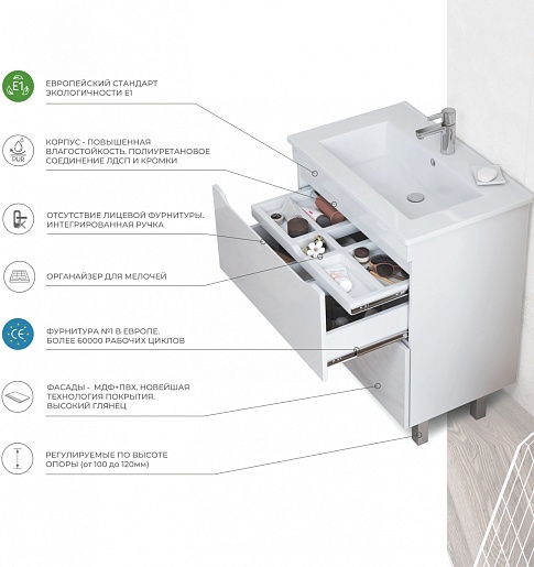 В комплекте: тумба, раковина, зеркало, ножка (4 шт.).