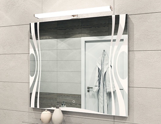 - Зеркало Leo 1000: зеркальное полотно с пескоструйным рисунком,1 светодиодный светильник, сенсорное управление.