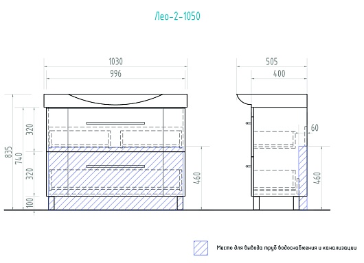 - Тумба с раковиной Leo 1050: умывальник Элвис 105, выдвижной фасад - 2 шт., скрытые направляющие полного выдвижения, механизм мягкого бесшумного самозакрывания (Hettich,Германия).