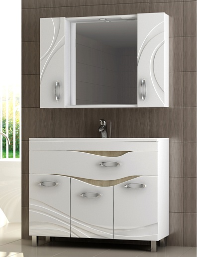 В комплекте: тумба, раковина, зеркальный шкаф, ножки.