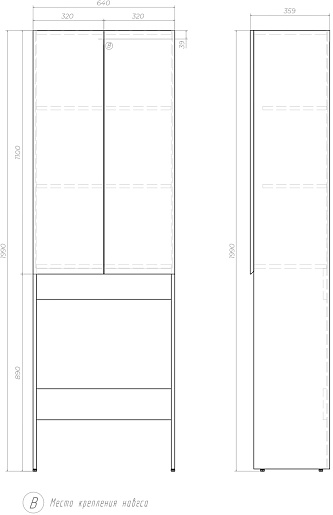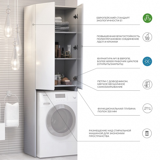 - Система хранения: 2 дверцы, 1 ниша для стиральной машины.