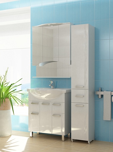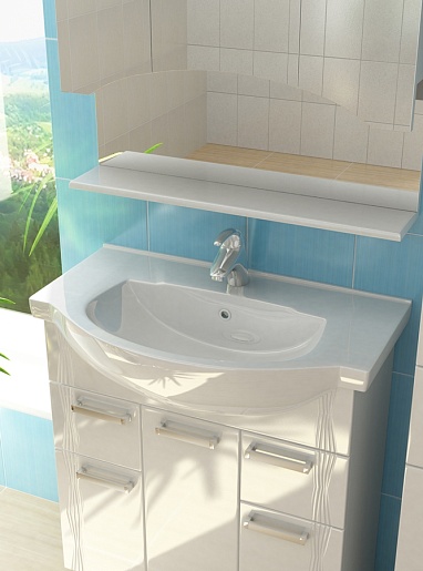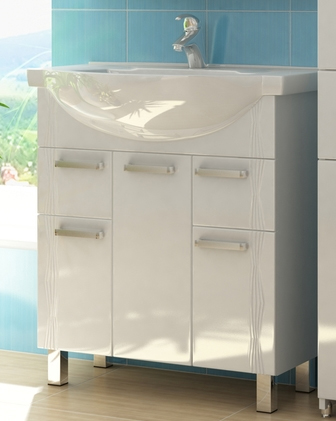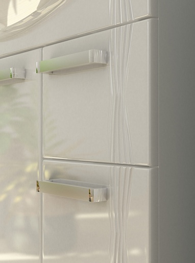 - тумба под раковину: 3 распашные дверцы и выдвижной ящик с механизмом плавного закрывания, вкладные полки, 5 металлических ручек (хром), регулируемые ножки