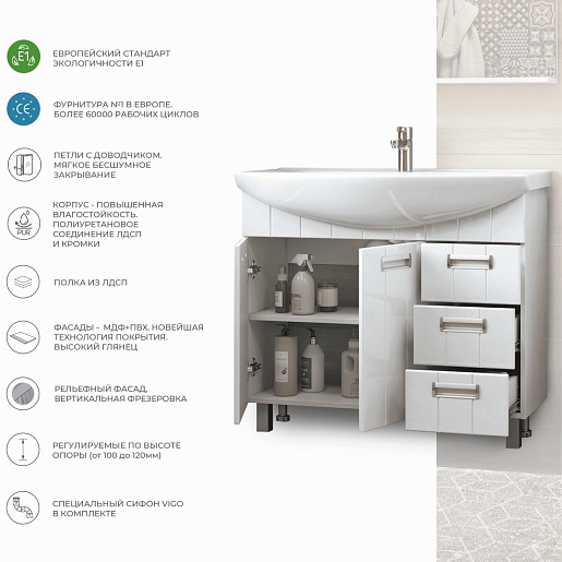 В комплекте: тумба, раковина, сифон.