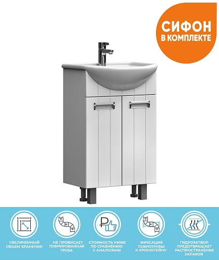 В комплекте: тумба, раковина, ножки (4 шт.), сифон.