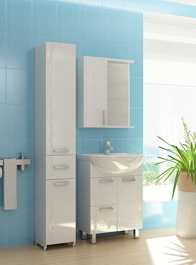 Комплектация: зеркальное полотно с нижней полкой и козырьком. Слева расположен глянцевый распашной шкаф с механизмом плавного закрывания, вкладными полками и хромированной ручкой. Галогеновый светильник, розетка.
