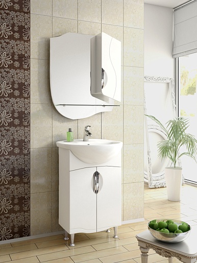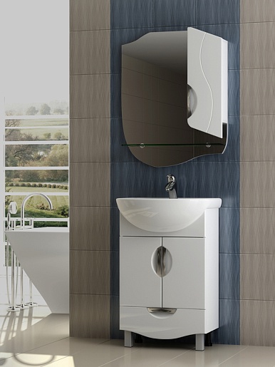 Комплектация: зеркальное полотно асимметричной формы со стеклянной полочкой толщиной 8 мм. Справа от зеркала расположен распашной шкаф с механизмом плавного закрывания, вкладными полками и врезной хромированной, металлической ручкой.