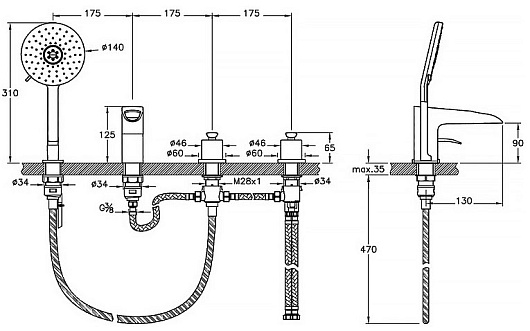 - монтаж на 4 отверстия на борт ванны