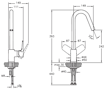 - монтаж на одно отверстие