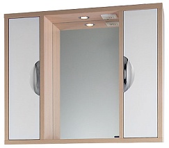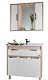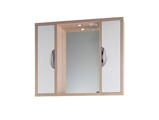 Комплектация: влагостойкая зеркальная панель с открытой полочкой, два боковых шкафчик с распашными дверцами, галогеновый светильник, розетка для фена или бритвы. Стильный белый фасад с отделкой беленым дубом.