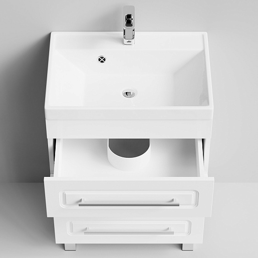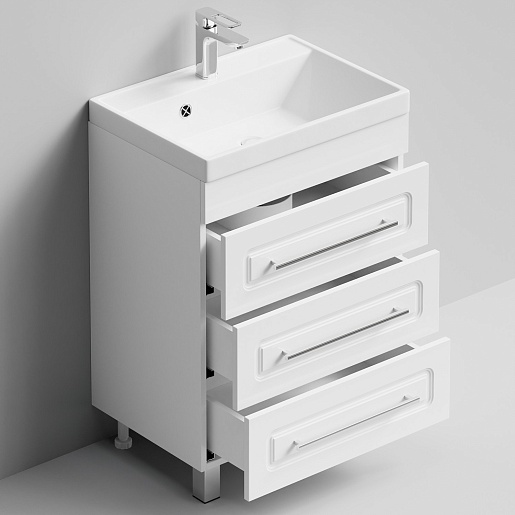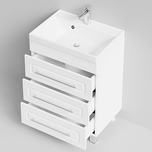 - Тумба с раковиной Арабеска 60: умывальник Madera Classic 60 (литьевой мрамор), тумба под раковину, ручки и ножки из металла, петли и ящики с доводчиками.