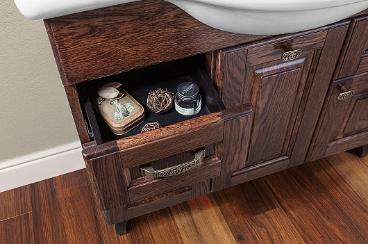 - Тумба под раковину Дубини 85: корпус и фасад изготовлены из массива дуба. Современные механизмы ящиков и петель Blum Legrabox (Австрия) оснащены доводчиками, дно ящиков декорировано бархатом.