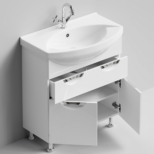 - Тумба с раковиной Лира 75 с ящиками: раковина Лагуна 75, распашные дверцы, вкладные полки, ящики оборудованы системой полного выдвижения, ручка (металл, врезная) - 4 шт., ножки (комплект из 4 шт.): металл - 2 шт., пластик - 2 шт.