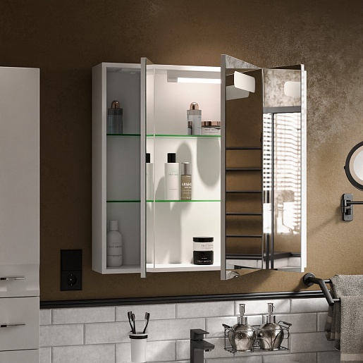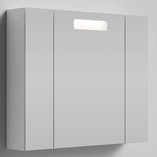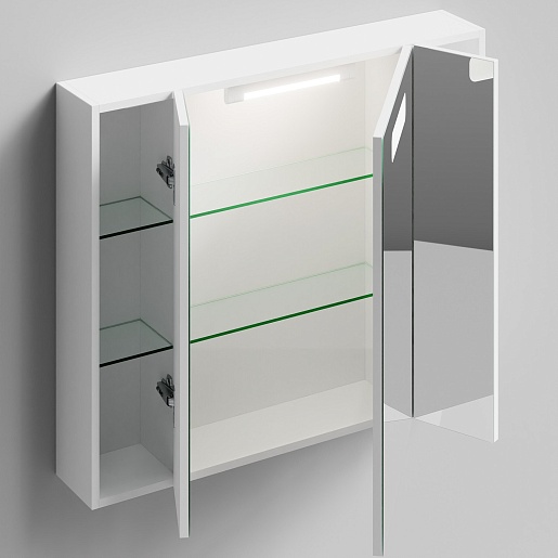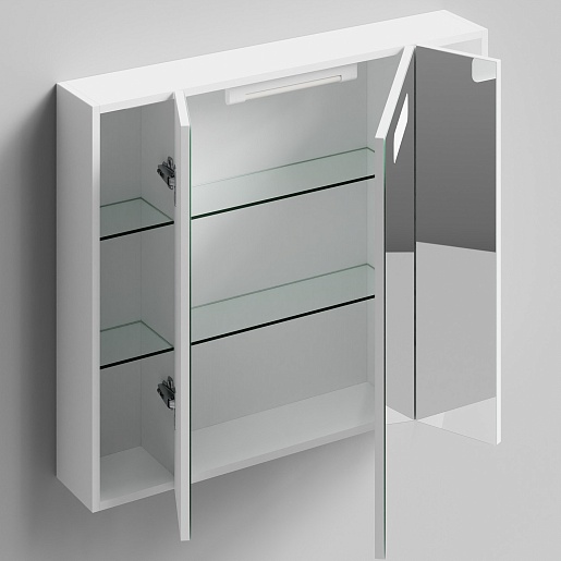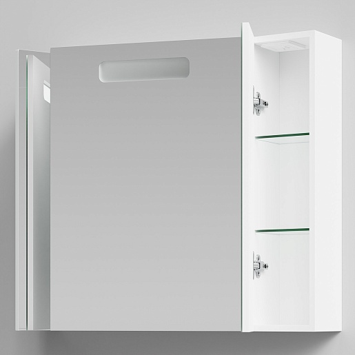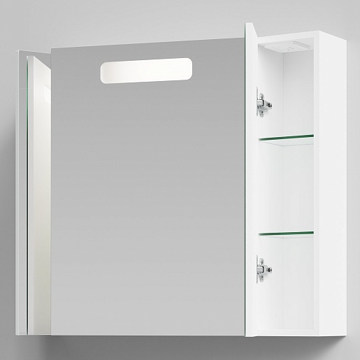 - Зеркальный шкаф Мальта 90: влагостойкое зеркало, галогенная подсветка, розетка и выключатель.