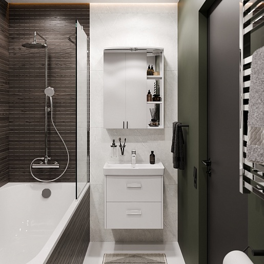- Зеркальный шкаф Мона 60 L: распашная дверца - 1 шт., вкладная полка - 2 шт., стеклянная полка - 2 шт. галогенный светильник, выключатель и розетка