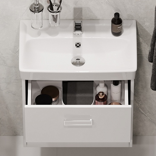 - Тумба под раковину Мона 60 с ящиками: раковина Мини 60, выдвижной ящик - 2 шт., ручка (хром, белый пластик) - 2 шт., ящики оборудованы системой плавного закрывания