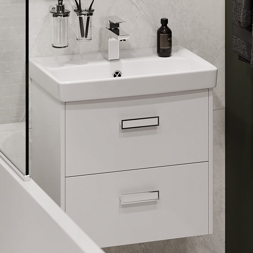 - Тумба под раковину Мона 60 с ящиками: раковина Мини 60, выдвижной ящик - 2 шт., ручка (хром, белый пластик) - 2 шт., ящики оборудованы системой плавного закрывания