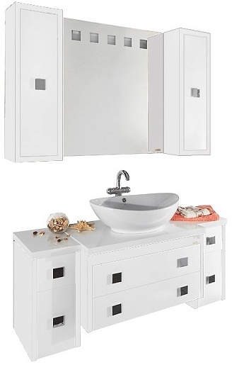 Комплектация: Подвесная тумба со столешницей из акрилового камня с двумя выдвижными ящиками, настольная фаянсовая раковина "Гамма 560", фасад с контрастной отделкой. Тумбы и подвесные шкафы приобретаются отдельно.