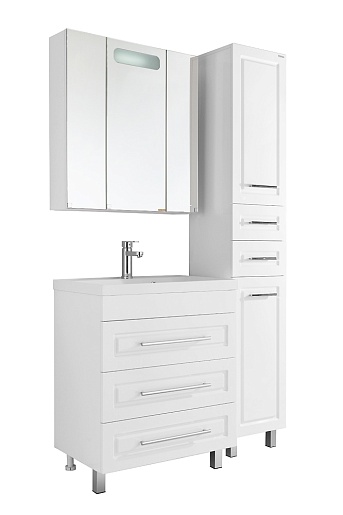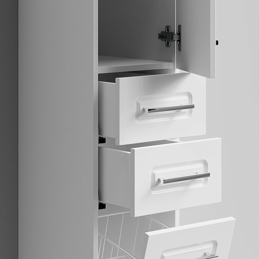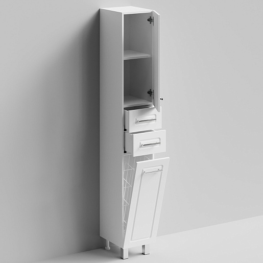 Комплектация: напольный пенал с двумя распашными дверцами и двумя выдвижными ящиками в центре. Корзина для белья. Ориентация дверей — правая.