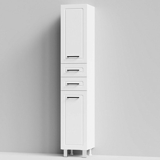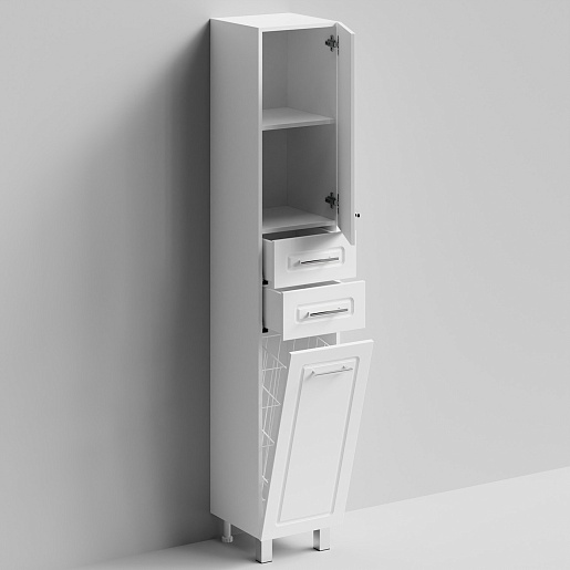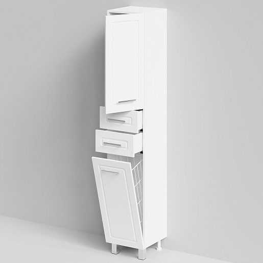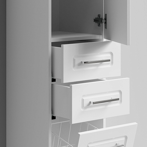 Комплектация: напольный пенал с двумя распашными дверцами и двумя выдвижными ящиками в центре. Корзина для белья. Ориентация дверей — правая.