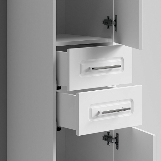 Комплектация: напольный пенал с двумя распашными дверцами и двумя выдвижными ящиками в центре. Ориентация дверей — правая.
