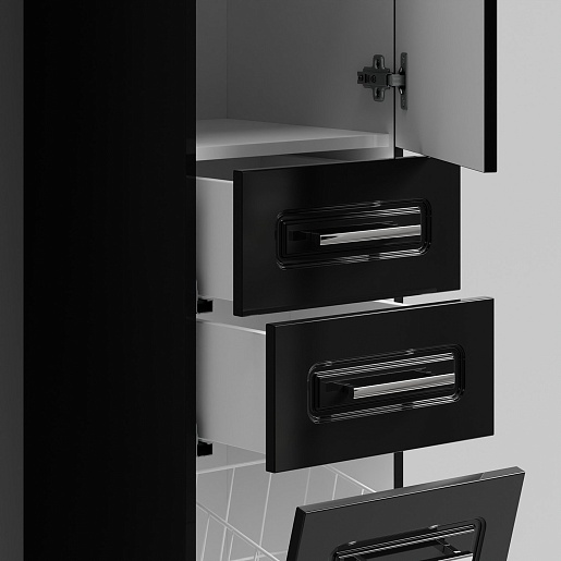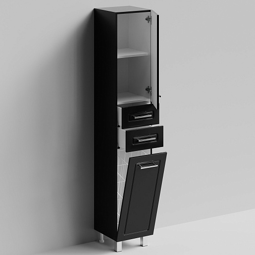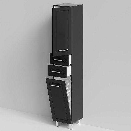 Комплектация: напольный пенал с двумя распашными дверцами и двумя выдвижными ящиками в центре. Корзина для белья. Ориентация дверей — правая.