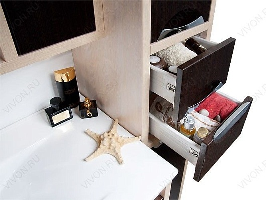 Комплектация: две распашные дверцы, два выдвижных ящика, регулируемые по высоте ножки. Ориентация дверей — левая. Фасад венге, корпус белый.