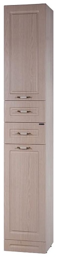 Комплектация: наверху секция с распашной дверцей (ориентация — левая), в центре два выдвижных ящика, внизу откидное отделение с бельевой корзиной.