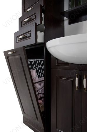 Комплектация: наверху секция с распашной дверцей (ориентация — правая), в центре два выдвижных ящика, внизу откидное отделение с бельевой корзиной.