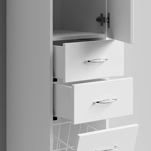Описание: Закрытые верхнее и нижнее отделения, в центре два выдвижных ящика, корзина для белья.