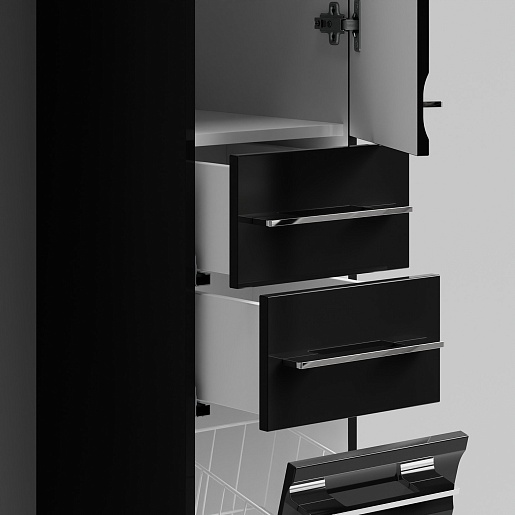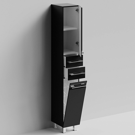 Комплектация: напольный пенал с двумя распашными дверцами и двумя выдвижными ящиками в центре. Бельевая корзина. Ориентация дверей — правая.