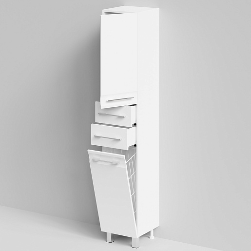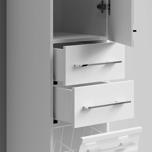 Комплектация: напольный пенал с распашной дверцей, двумя выдвижными ящиками в центре и откидным фасадом с бельевой корзиной. Ориентация дверей — правая.