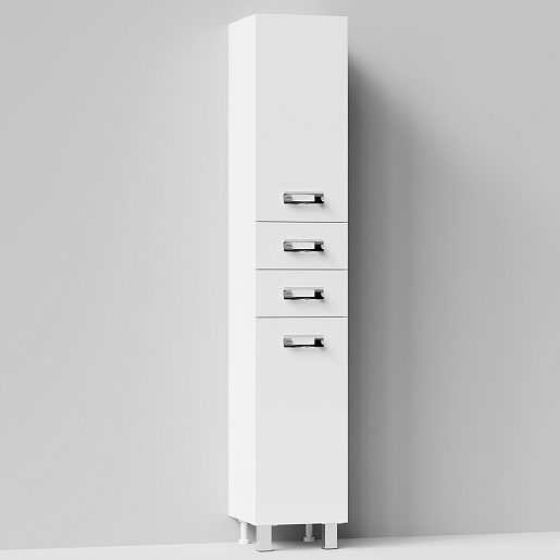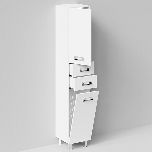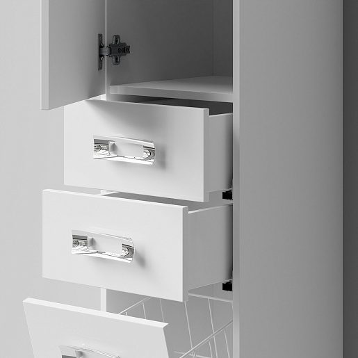 Комплектация: напольный пенал с двумя распашными дверцами и двумя выдвижными ящиками в центре. Бельевая корзина. Ориентация дверей — левая.