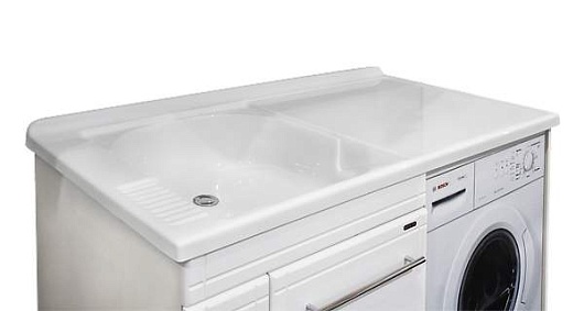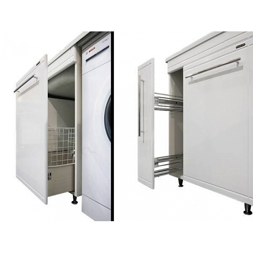 Описание: напольная тумба с ножками, двумя выдвижными ящиками, один из которых можно использовать для хранения бытовой химии, другой — для белья, большая акриловая столешница со встроенной раковиной, открытая ниша для стиральной машины.