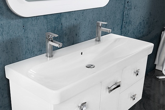 Описание: Пять ящиков. Тумба с умывальником Classica 120 (Madera) с 2-мя чашами. Корпус и фасад окрашенный МДФ (5 слоев, покраска SAYERLACK Италия), петли с доводчиками на дверцах, ящики оборудованы направляющими скрытого монтажа с доводчиками фирмы Blum (Австрия), внутри ящиков коврики.
