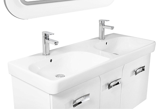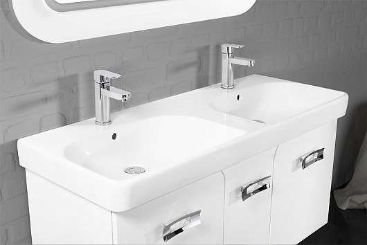 Описание: Два распашных фасада, один ящик. Тумба с умывальником Classica 120 (Madera) с 2-мя чашами и с 2-мя отверстиями под смеситель. Корпус и фасад окрашенный МДФ (5 слоев, покраска SAYERLACK Италия), петли с доводчиками на дверцах, ящики оборудованы направляющими скрытого монтажа с доводчиками фирмы Blum (Австрия), внутри ящиков коврики.