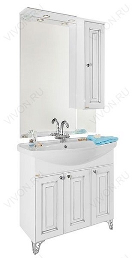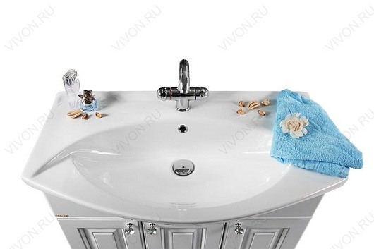 - тумба под раковину: распашная дверца - 3 шт., вкладные полки, ручка (металл, стекло) - 3 шт., ножки хром.