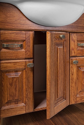 - Тумба под раковину Дубини 105: корпус и фасад изготовлены из массива дуба. Современные механизмы ящиков и петель Blum Legrabox (Австрия) оснащены доводчиками, дно ящиков декорировано бархатом.