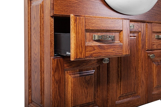 - Тумба под раковину Дубини 85: корпус и фасад изготовлены из массива дуба. Современные механизмы ящиков и петель Blum Legrabox (Австрия) оснащены доводчиками, дно ящиков декорировано бархатом.