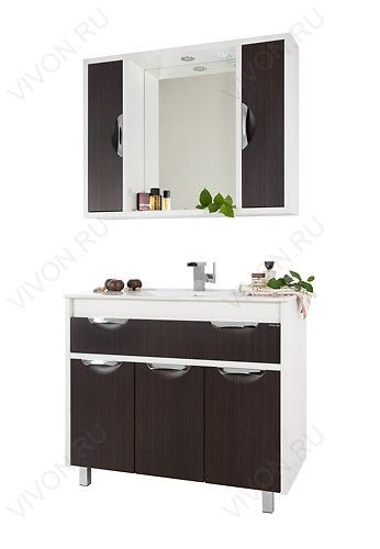 Комплектация: влагостойкая зеркальная панель с открытой полочкой, два боковых шкафчик с распашными дверцами, галогеновый светильник, розетка для фена или бритвы. Фасад венге, корпус белый.
