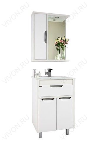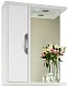Комплектация: влагостойкая зеркальная панель с полочкой, шкафчик с распашной дверцей, подсветка с автономным выключателем, розетка для фена или бритвы.