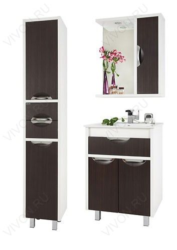 Комплектация: влагостойкая зеркальная панель с полочкой, шкафчик с распашной дверцей, подсветка с автономным выключателем, розетка для фена или бритвы. Фасад венге, корпус белый.
