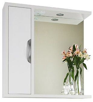 Комплектация: влагостойкая зеркальная панель с полочкой, шкафчик с распашной дверцей, подсветка с автономным выключателем, розетка для фена или бритвы.